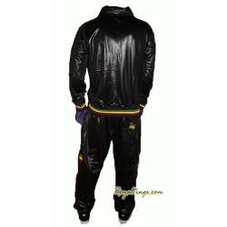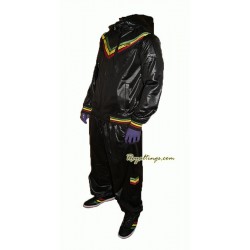 2 poches à scratch sur la veste et pantalon, 2 poches arrieres., fermeture à boutons, bandes vert jaune rouge surpiquées